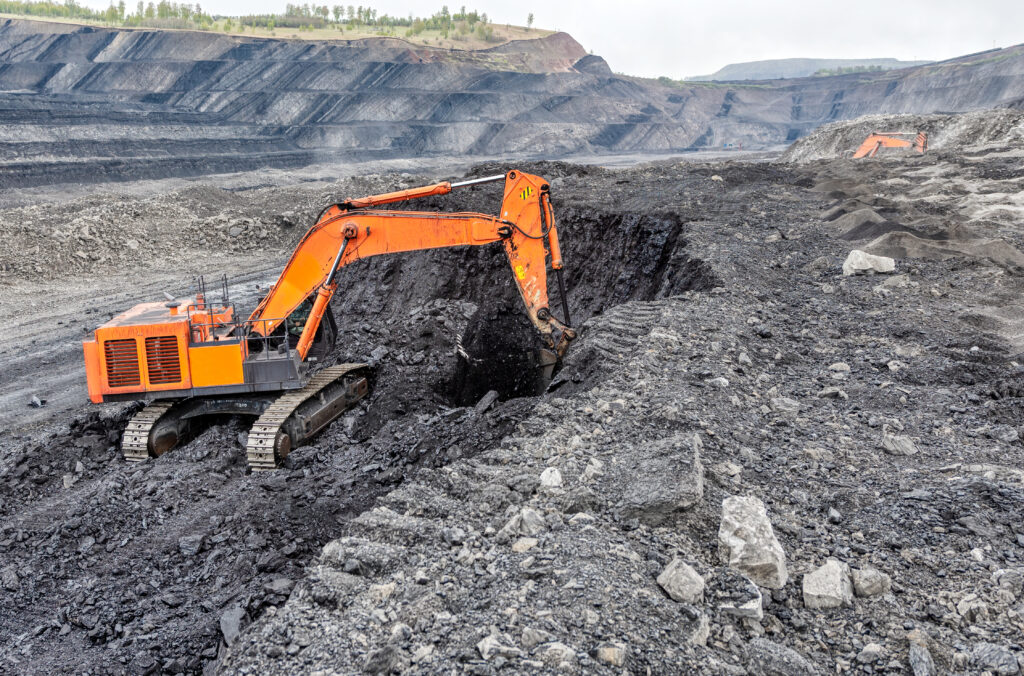 Coal mining with a hydraulic excavator. Mining of coal from the reservoir, an open-pit mining method.